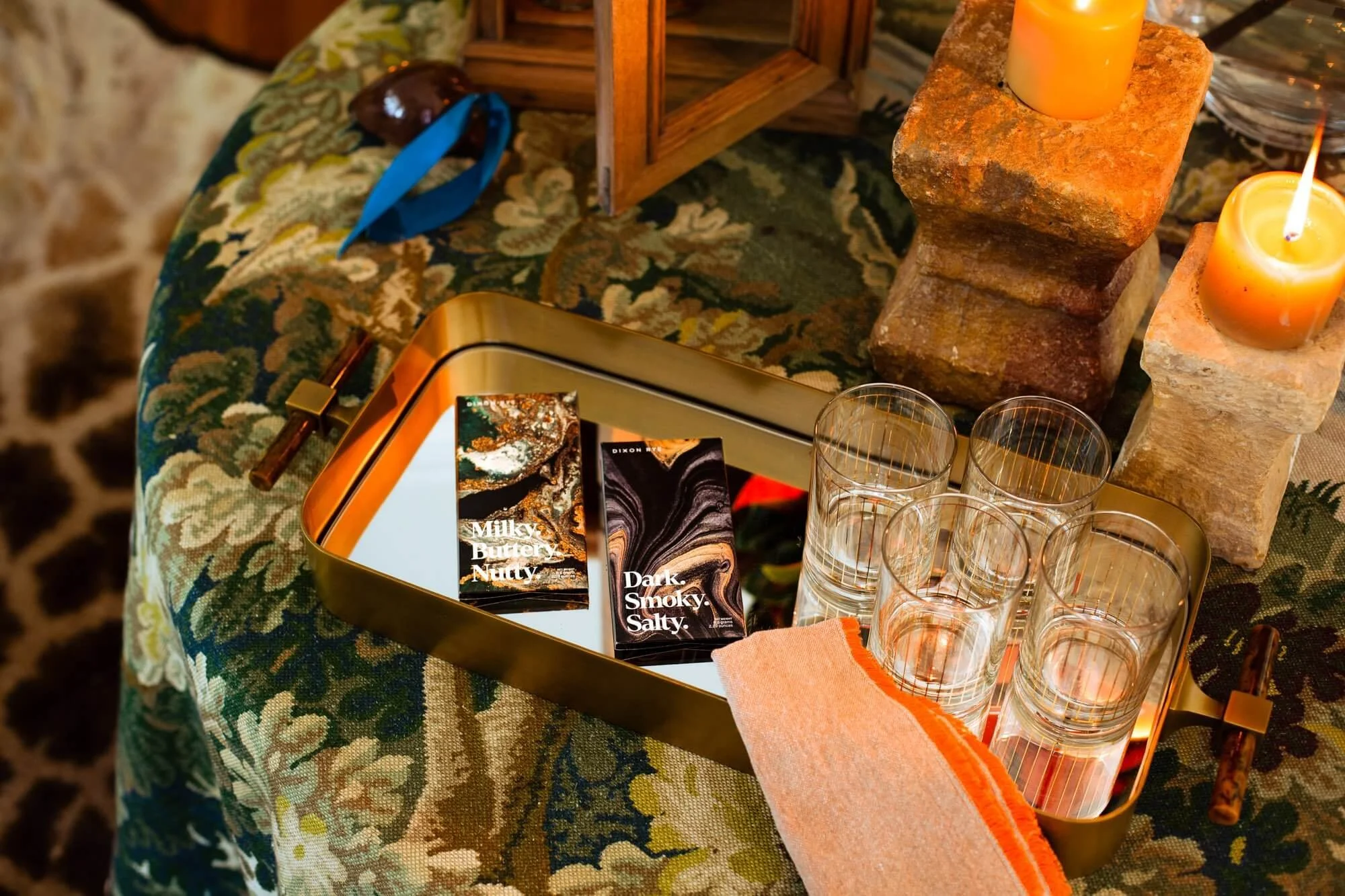 For the project, I started by developing the large, bold name for each product based on its flavor profile and having the title dominate the cover of the packaging in a beautiful serif display typeface. Each product was then paired with a marbleized background texture, and the back of each has a clean lockup of in-depth information on notes, origins, and ingredients. The inside of the packaging features the custom Dixon Rye-branded floral pattern in an inverted subtle gray on black for a luxe look.