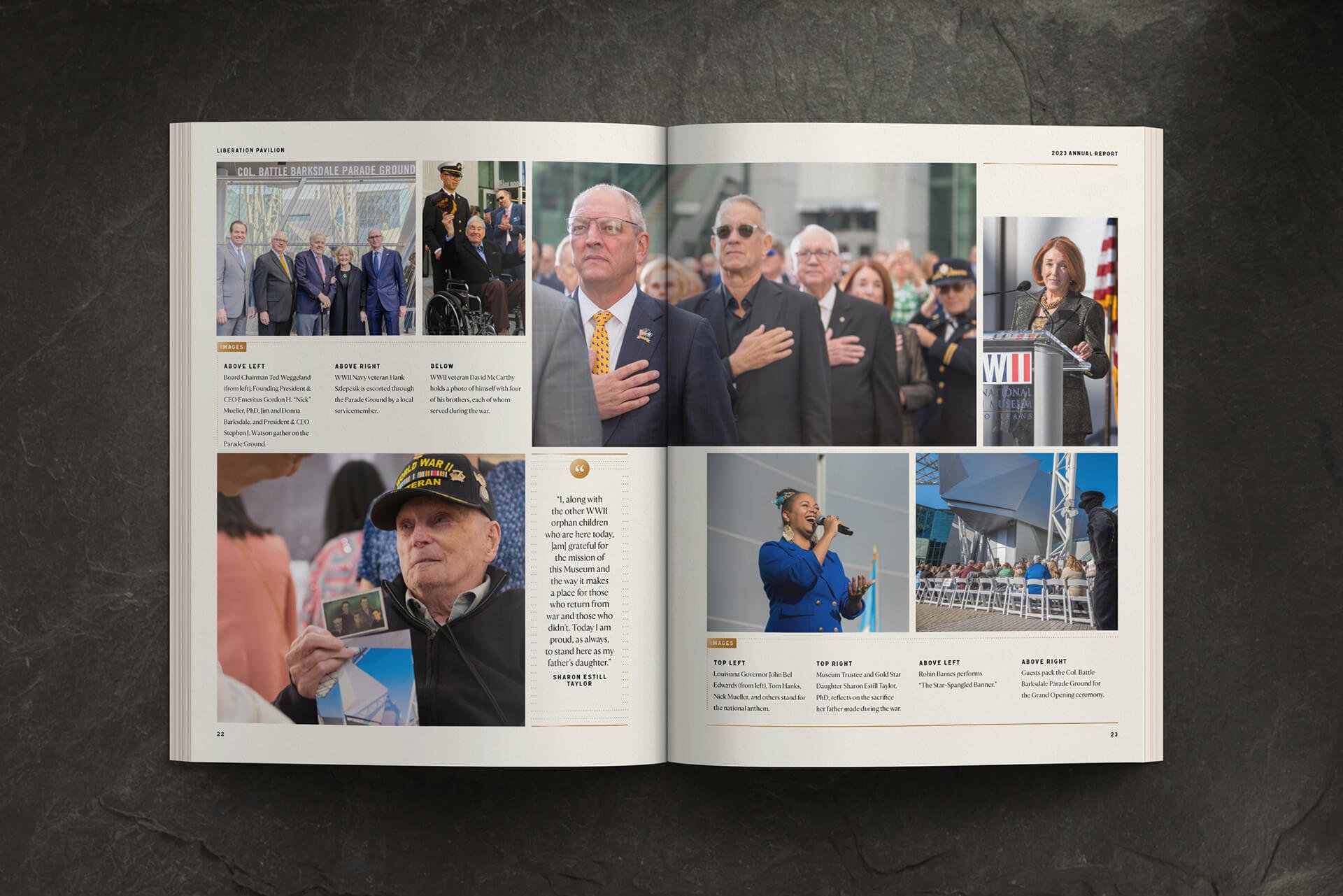 After working together on the design of the 2022 annual, the museum’s team reached out to collaborate on a new publication for 2023. With the opening of the Liberation Pavilion as the long-awaited, crowning achievement, this year marked the completion of the vision for the campus. As such, we designed the report to feel like a celebration and a conclusion—a sophisticated capstone to many years of care and effort by all involved.